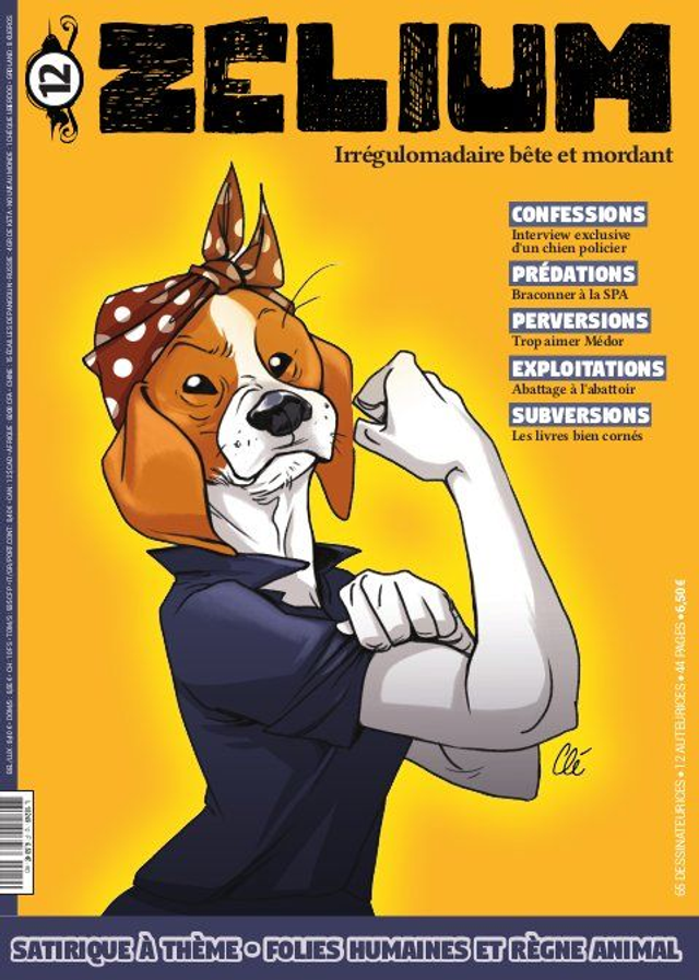 Zélium 12 spécial animaux, magazine bête et mordant sur l'animal et son rapport contraint avec l'Homme (et la femme). Bestialité hulmaines, humanités animales. etc etc, couve plastifiée illustrée par Clé, avec une magnifique Rosie The Riveter (Rosie la riveteuse)